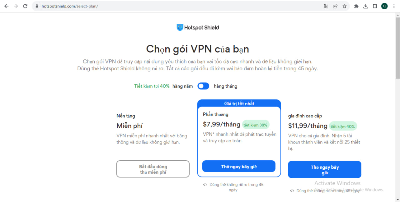 Gói dịch vụ trả phí và tính phí hiện nay của Hotspot Shield