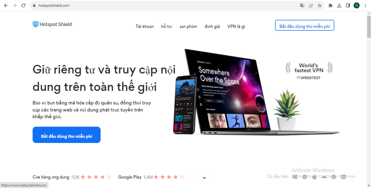 • Bước 1: tìm kiếm từ khóa “Hotspot Shield” hoặc truy cập ngay đường link: https://www.hotspotshield.com/vi/