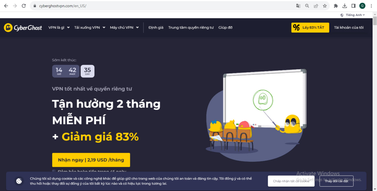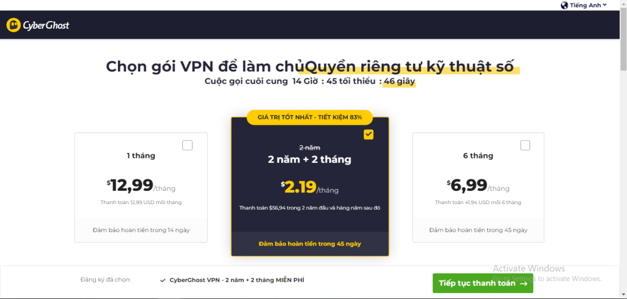 Giá thuê CyberGhost VPN một tháng giao động trong khoảng 12.99$ – 13.99$ tương đương với 311.000 VND – 335.000 VND.