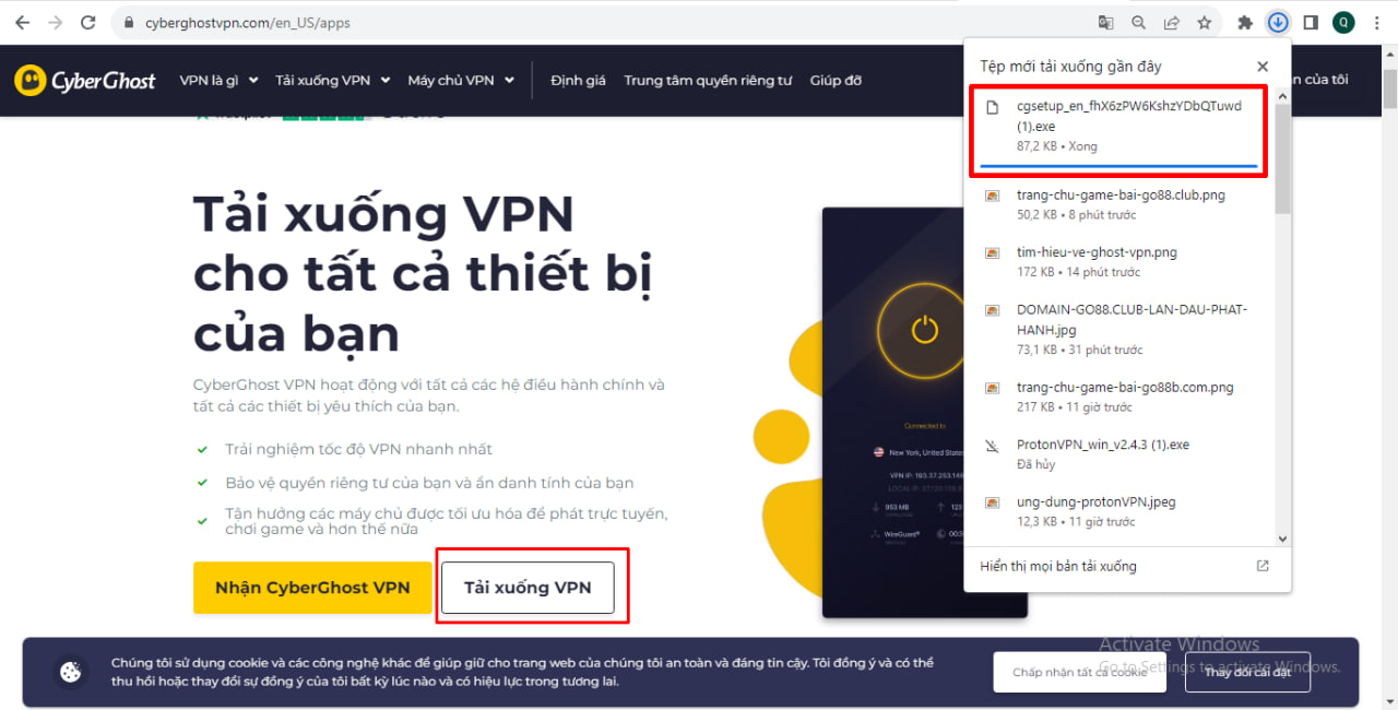 Truy cập domain trang chủ Go88.club bằng phần mềm CyberGhost VPN